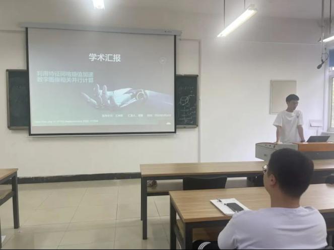 邵景同学的研究汇报题目为“利用特征网络差值加速数字图像相关并行计算”,他首先对数字图像处理测量的原理进行简单解释,便于大家理解。随后该同学进行了实验验证并与现有的方法进行比较。最后,总结了基于特征网络和初始值估计方法加速并行DICE计算的优点和不足。