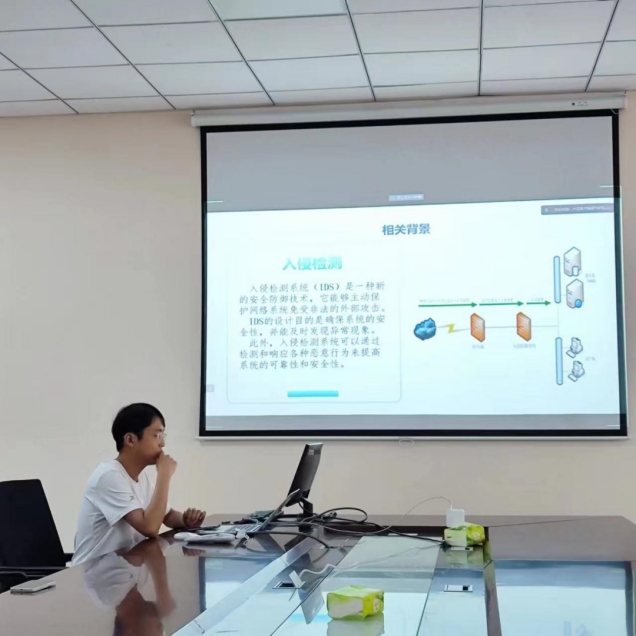 孙荣康同学的研究汇报题目为"入侵检测系统算法的初期探究",首先介绍了入侵检测算法的相关背景,然后详细介绍了算法的主要流程、数据集、数据预处理、特征提取、测试数据。后对实验进行了分析,使用one-hot编码,将离散特征的取值扩展到了欧式空间,离散特征的某个取值就对应欧式空间的某个点。将离散型特征使用one-hot编码,会让特征之间的距离计算更加合理。最后进行总结,我们要明确的是并不存在一种“完美的”机器学习算法,能够出色地解决任何问题。对于某个问题,有的方法是适合的,有的则反之。目前机器学习在入侵检测领域的应用越来越多,众多的机器学习算法给入侵检测带来了更多的研究发展空间,相信在经过广大学者们的发掘后,将来还会出现更多适配性更加优秀的算法。